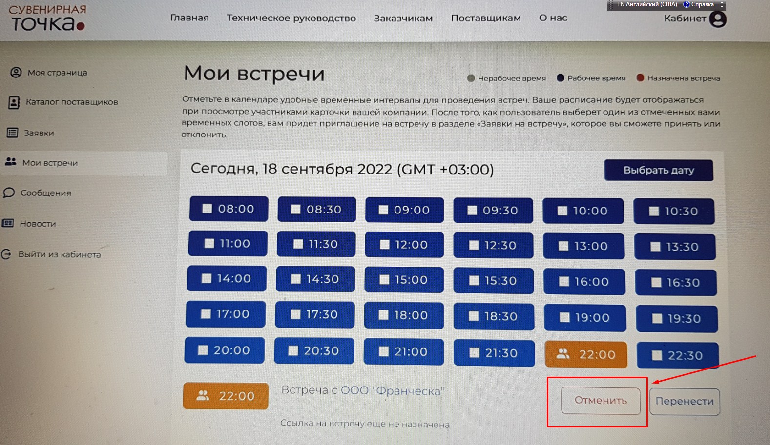 Выбрав интересующую компанию в каталоге, кликнув на ее название, вы переходите на карточку компании, где вы можете назначить встречу в свободные временные интервалы, выделенные синим цветом. Одна встреча длится не более 30 минут. При желании вы можете выбрать два временных слота подряд.